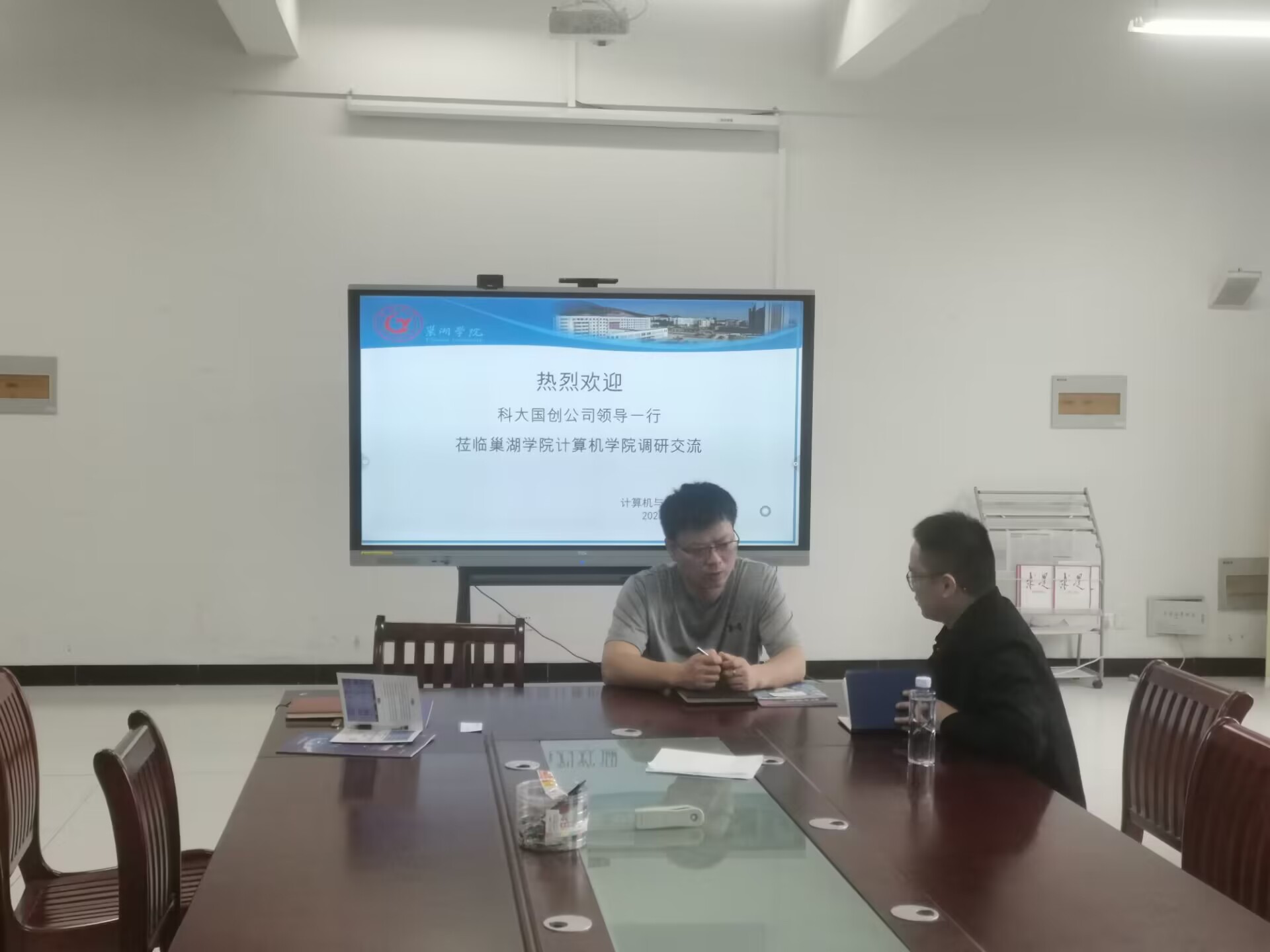 5月26日上午,科大国创软件股份有限公司校招部经理李山山到计算机与人工智能学院走访交流,院企双方在慎思楼一楼会议室进行座谈交流,院党委副书记王震宇、就业联络员梁腾飞参加会议。