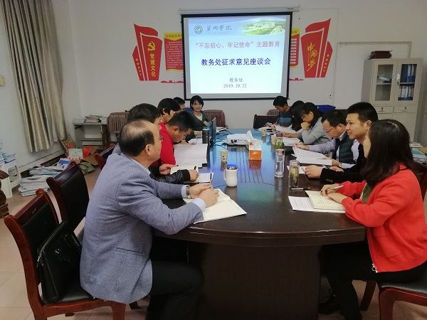 为深入推进 “不忘初心、牢记使命”主题教育,10月22日下午,教务处在会议室组织召开“不忘初心、牢记使命”主题教育征求意见座谈会,教务处处长丁俊苗、副处长许雪艳、胡传双、谢如龙以及各学院教师代表参加座谈会,会议由丁俊苗主持。