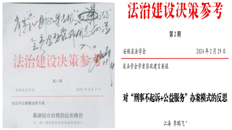 法学专业坚持以服务求支持,以贡献促发展。依据安徽省“三地一区”建设行动方案和服务环巢湖区域经济社会发展行动提升计划,法学专业与巢湖市政法委、巢湖市人民检察院等法治单位签订应用型课题研究-实习-毕业论文一体化产学研合作协议,推进“卓越法治人才”协同培育和地方法治文化建设;依托学校“法律服务中心”为全校师生提供法律咨询诉讼服务,促进法治校园和法治社会建设;依托科研,为地方法治建设发挥智囊作用,《巢湖综合治理的法治路径》获安徽省委常委、政法委书记肯定批示,《“刑事不起诉+公益服务”办案模式的反思与建议》被安徽省法学“法治建设决策参考”采纳,报送中国法学会、安徽省委政法委、安徽省检察院、省高院等决策参考。