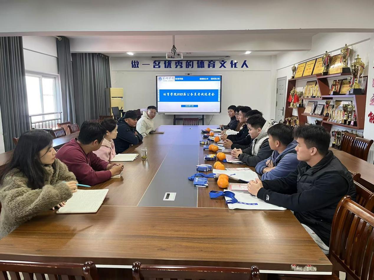 11月28日,2025年度中央机关及其直属机构考公在即,为缓解考生压力,引导学生坚定信心,以饱满的精神状态和昂扬的奋斗姿态迎考,体育学院在会议室召开了考公学生送考会。体育学院院长赵胜国,党委副书记、纪委书记朱春花以及全体辅导员参加了活动。