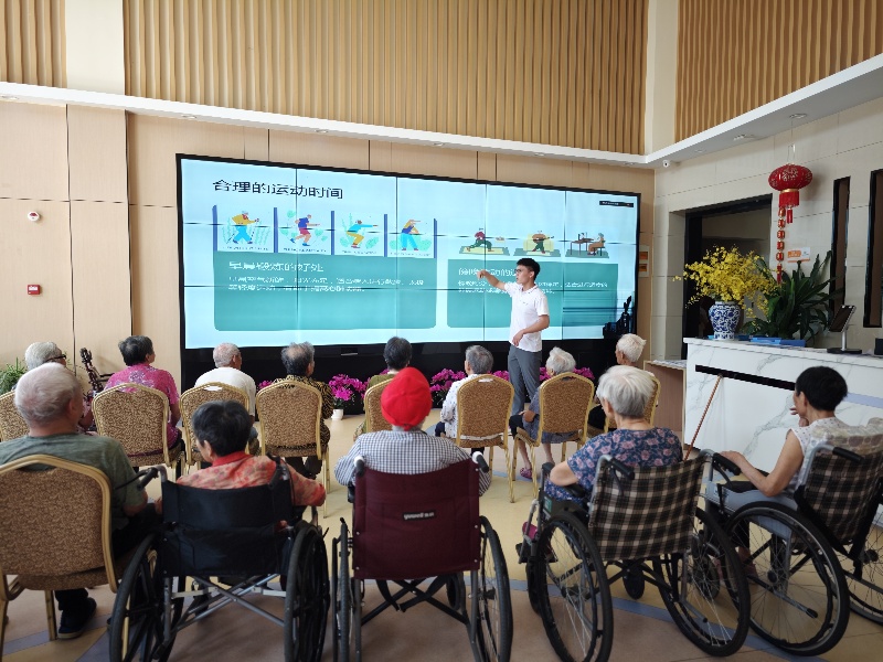 巢湖九久夕阳红护理院的活动中,队长李兴凡借助ppt系统讲解老年人的健康活动与饮食知识,强调运动与休息的平衡,推荐早晨散步、太极及傍晚伸展、瑜伽等运动,建议每晚7—8小时睡眠与适当午休,且每活动45分钟休息15分钟;饮食上则倡导均衡营养,多摄入蔬菜水果、优质蛋白,限制“三高”及刺激性食物。讲解过程中,李兴凡积极与老人互动,调动参与热情。