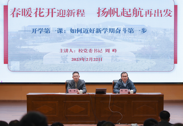 为深入学习贯彻习近平新时代中国特色社会主义思想和党的二十大精神,全面贯彻落实党的教育方针,紧紧围绕立德树人根本任务,坚守为党育人、为国育才,认真落实党委书记带头讲思政课要求,2月22日下午,校党委书记周峰以《春暖花开迎新程扬帆起航再出发》为题在求实楼报告厅为全校师生讲授了一堂寓意深刻、意蕴深远的“开学第一课”,教会学生如何迈好新学期奋斗第一步。此次授课采用线上线下相结合的方式,15000余名师生全程观看。党委委员、副校长周祥主持“开学第一课”。